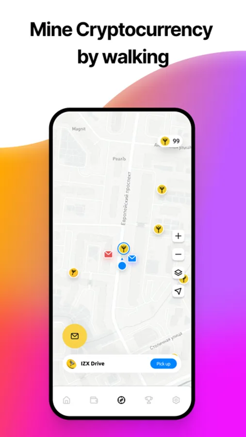 Сrypto tokens are scattered on the streets of the whole world. Search for the tokens on the map nearby your location, approach the token and catch it with your camera. You’ll get a detailed instruction on how to exchange your crypto for a prize or other freebees from IZX Partners.
