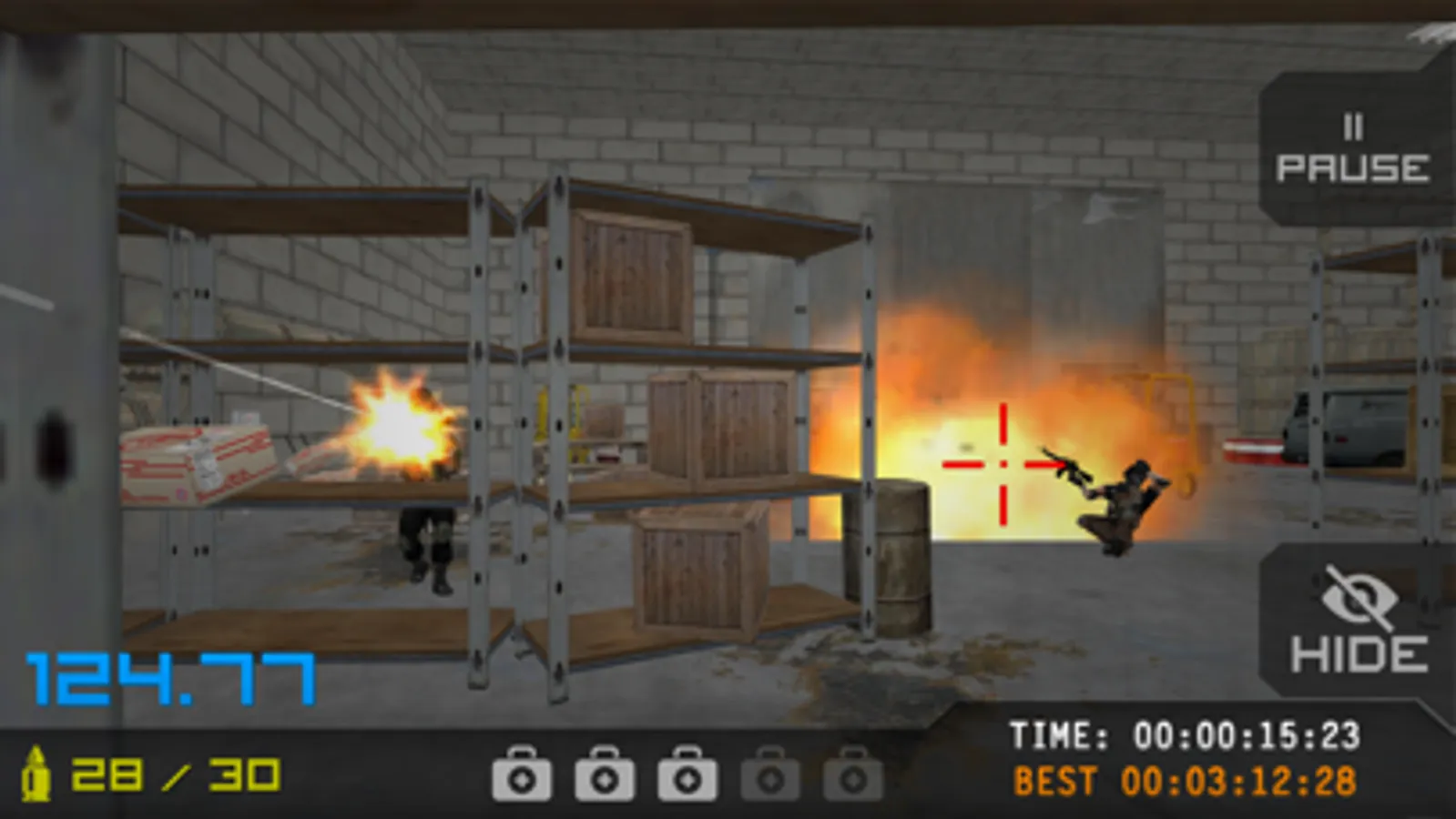 Interact with the environment and shoot objects to reveal hidden bonuses, you might find something to come in handy to help you get an even better highscore. Watch out you don't lose too much health or you will die, if you see a first aid health kit, be sure to pick it up. Use explosive barrels to take out multiple bad guys at once to help get point multipliers and bonuses.