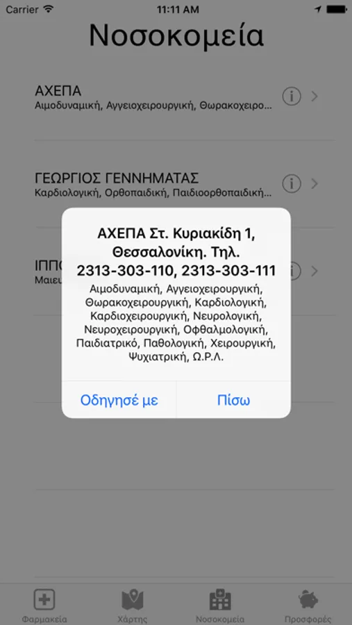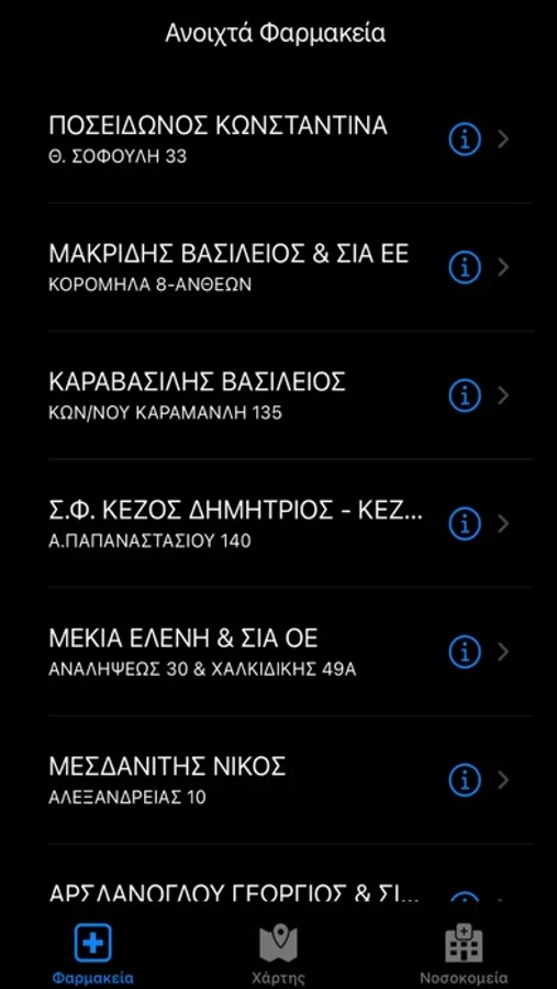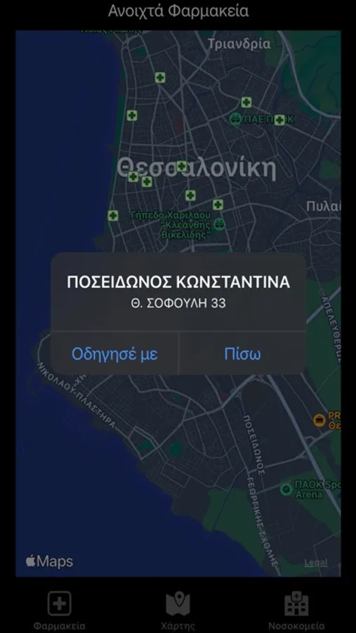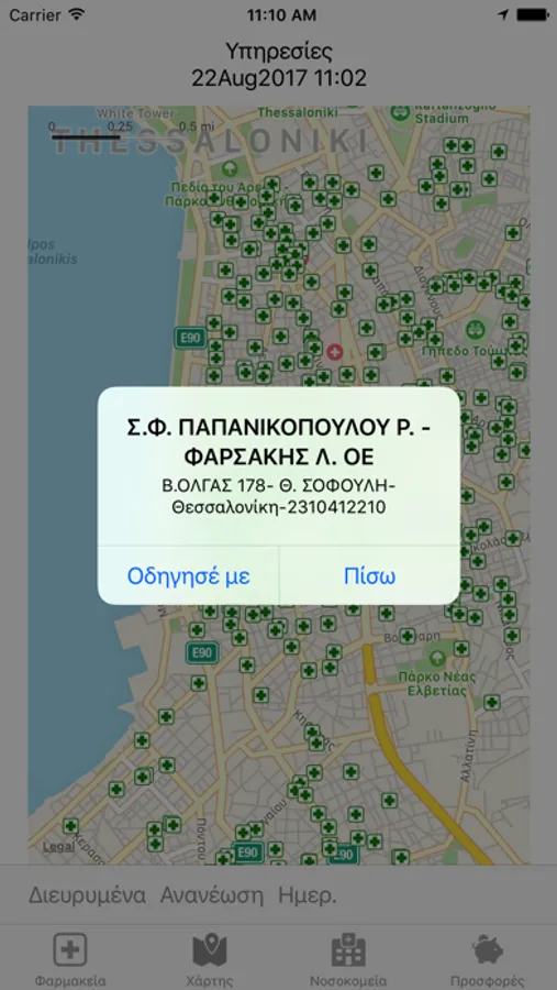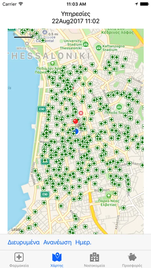 Αναζήτηση σε πραγματικό χρόνο καθώς και μεταγενέστερα, φαρμακείων και νοσοκομείων που εφημερεύουν στην Θεσσαλονίκη καθώς και προβολή εφημερίων φαρμακείων σε λοιπές περιοχές.