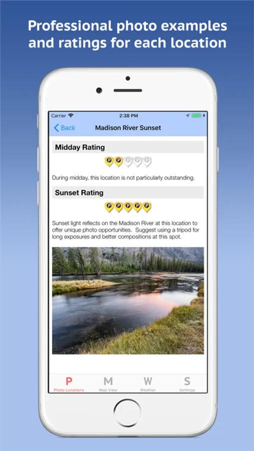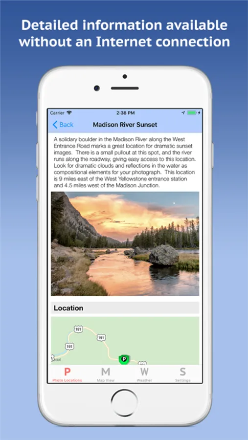 * Photo locations have sunrise, midday, and sunset ranking information to help you find the best location for the time of day.