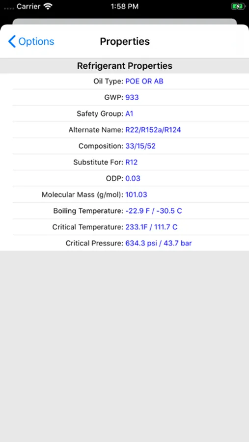9. Display common properties for the selected refrigerant (oil type, GWP, composition, critical temp, boiling temp, and more...)