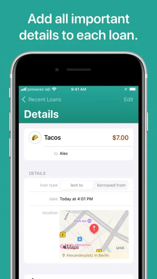 Keepfully allows you to link a person, location, time and title to each loan. This helps you to perfectly keep track of your money.