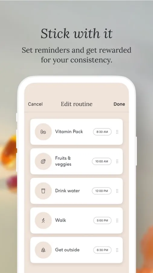 Take the quiz, get personalized vitamins delivered to you in convenient daily packs (with a touch of joy), and earn rewards (free stuff!) for taking your vitamins consistently. The Care/of app is your handy tool for reminding you to take your vitamins so you never miss a day (just like your mom, but different). We promise taking vitamins can be kinda fun.