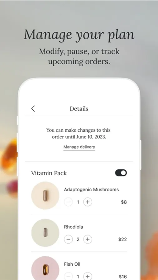 * Manage your subscription. Ensure your vitamins arrive just when you need them.