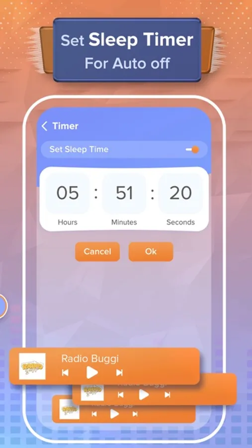 - Provides sleep timer option to turn off the radio playing at the given time.