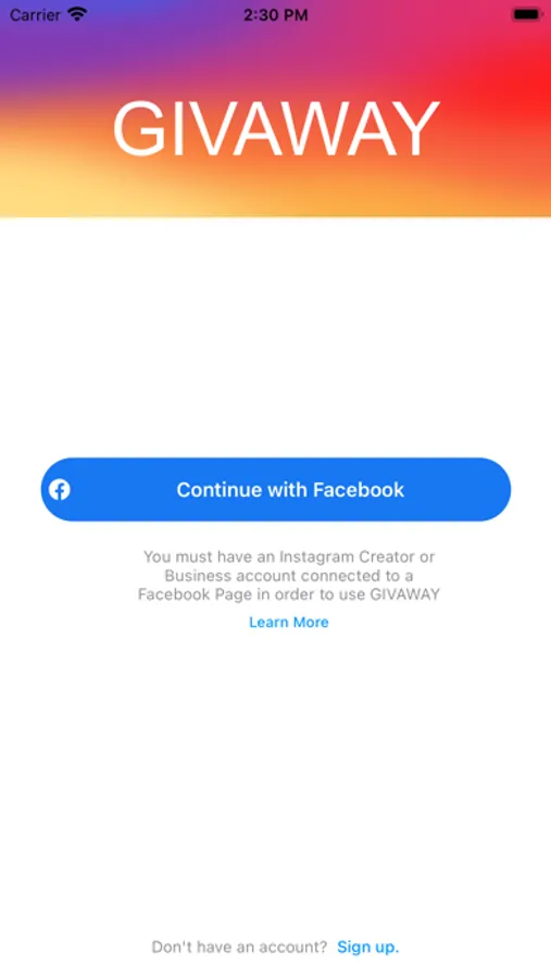 You must have an Instagram Creator or Business account connected to a Facebook Page in order to use GIVAWAY