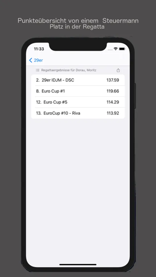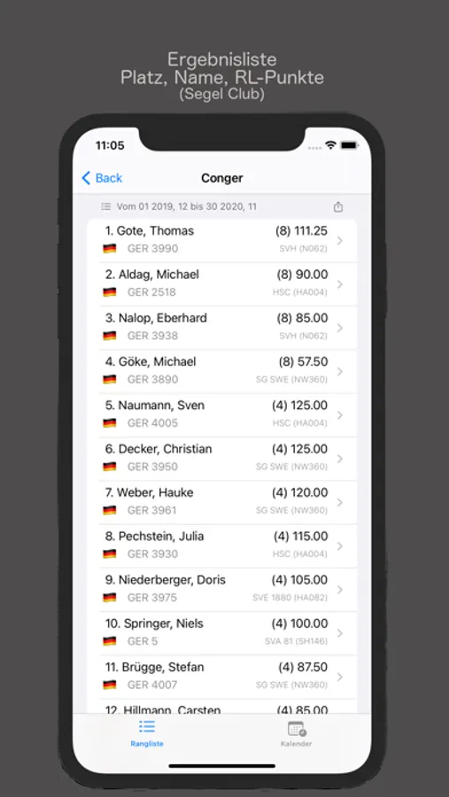 Die gesamte Rangliste der Klassenvereinigung (Platz, Steuermann, Club, falls genannt die Segelnummer, Anzahl der gewerteten Regatten und Gesamtpunkte) werden dargestellt. In der Einzelansicht werden Ihnen die einzelnen Ergebnisse der Steuerleute (Platz, Regattaname und erreichte Punkte) angezeigt.
