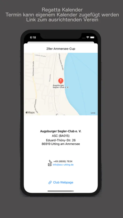 Info zum Verein: Es wird die Karte, die Adresse und Telefon / E-Mail Adresse angezeigt. Über den Link zum Verein könnt ihr die Webseite des Vereins aufrufen.