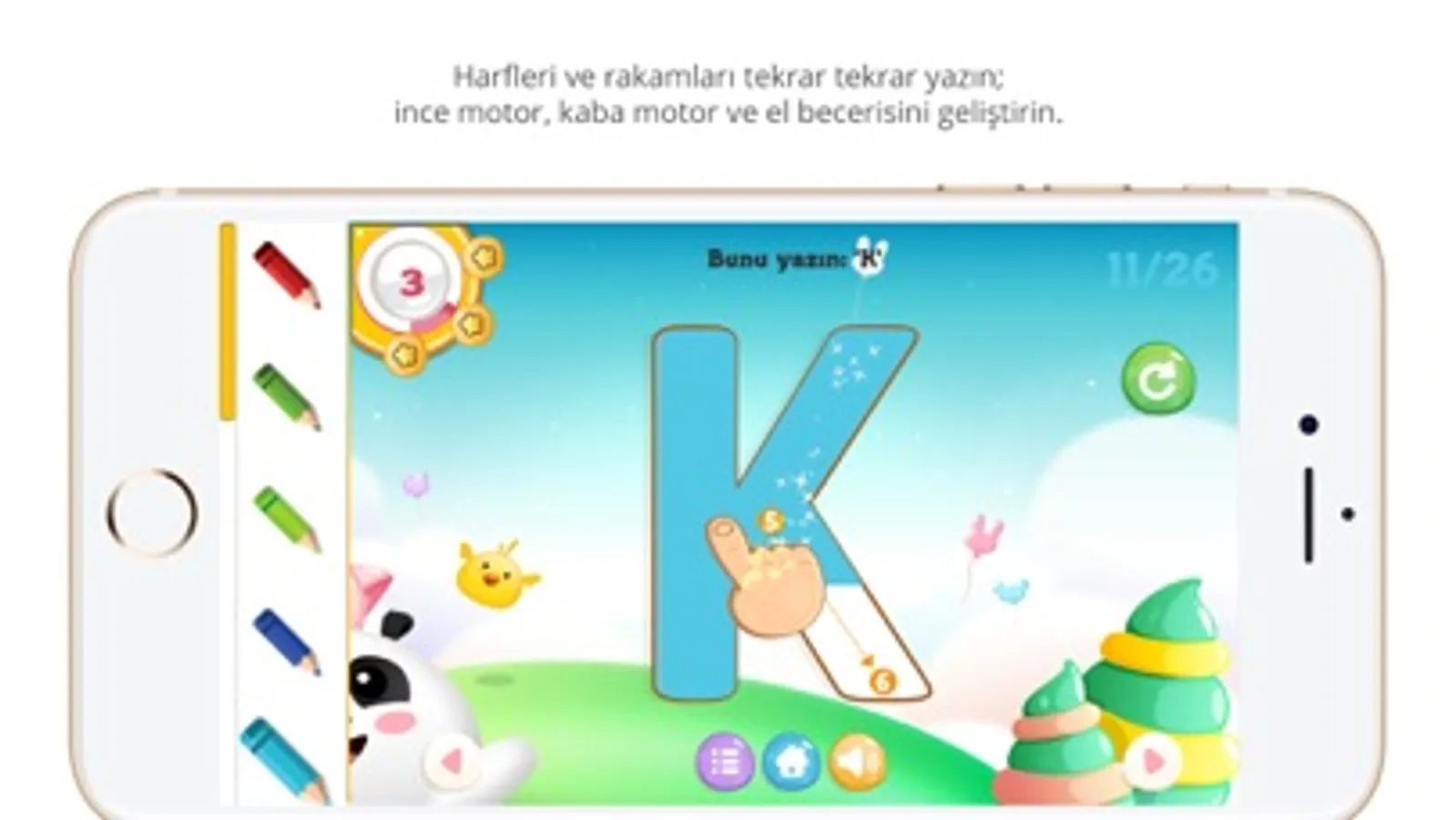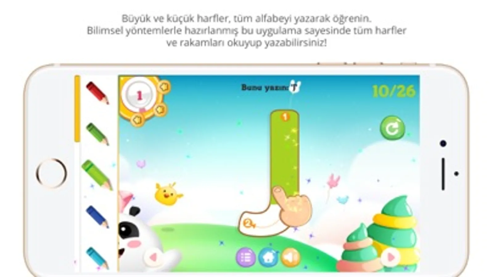 Büyük ve küçük harfler, tüm alfabeyi çocuğunuza yazdırarak öğretin. Bilimsel yöntemlerle hazırlanmış bu uygulama sayesinde çocuğunuz henüz okul çağı gelmeden harfleri okuyup yazabilir!