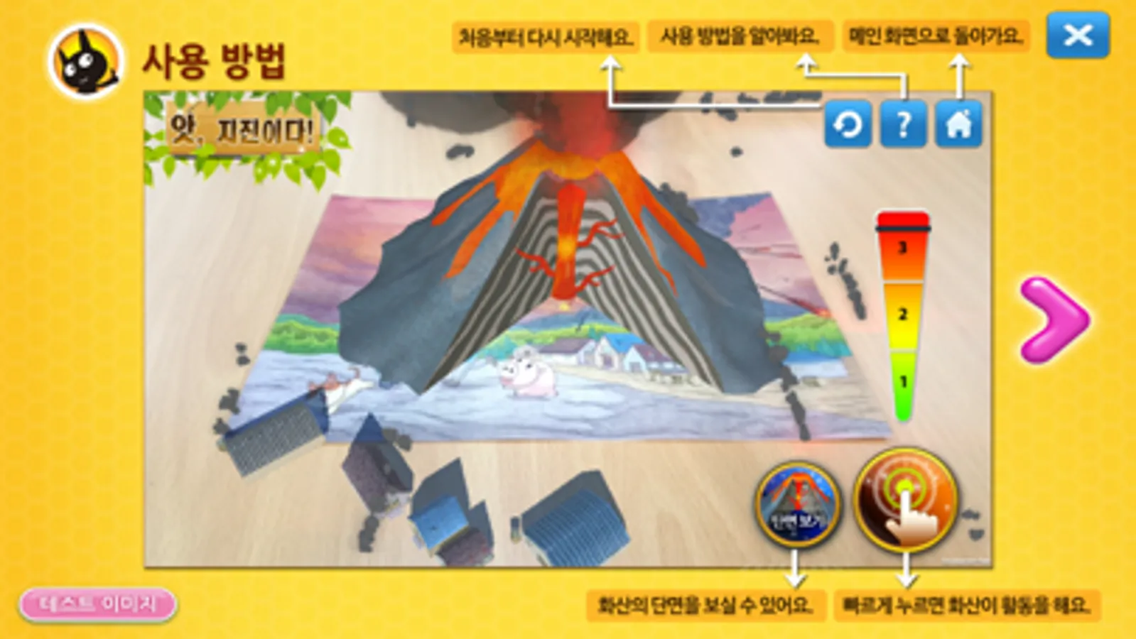 - 스마트 기기로 책을 비추면 화산이 살아 움직이는 마술 같은 책입니다.
