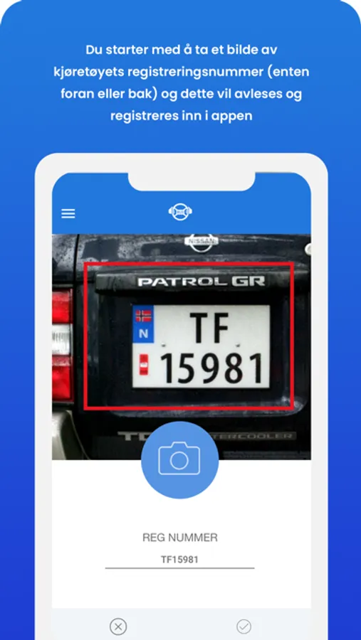 Du starter med å ta et bilde av kjøretøyets registreringsnummer (enten foran eller bak) og dette vil avleses og registreres inn i appen.