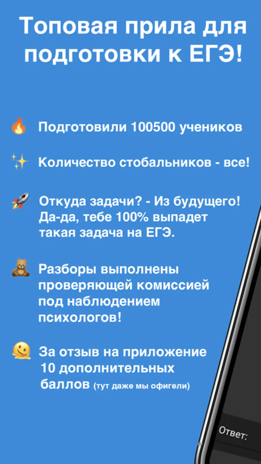 Готово! С этой установкой ты уже заработал 10 баллов. Остальные 90 ты получишь готовясь к ЕГЭ с нашим приложением!