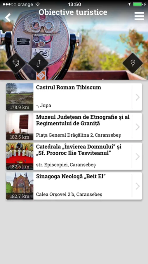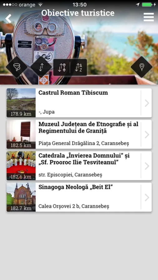 Toate elementele pot fi sortate alfabetic sau dupa distanta. De asemenea, se pot folosi optiuni de filtrare, in functie de tipul de punct de interes.