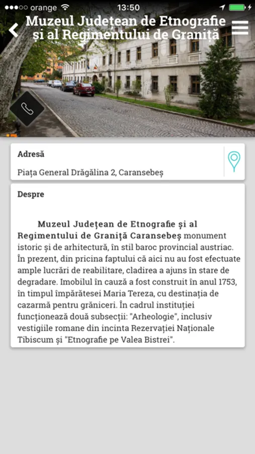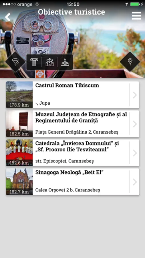 - Culture & Leisure: places in and around Caransebes that offer cultural and leisure activities (historical buildings, monuments, parks);