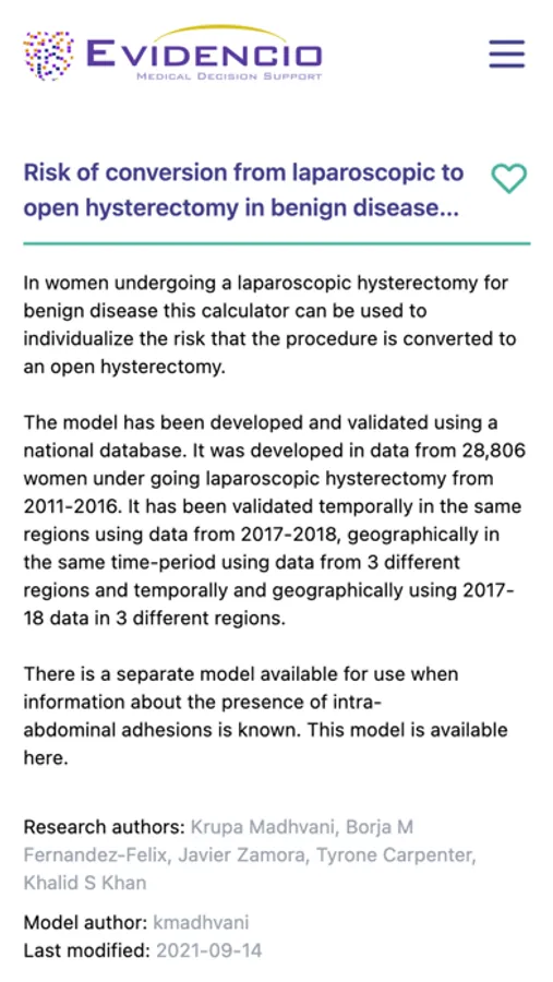 Registered users can configure favorite models for quick access. As a registered user you're also able to create your own models on Evidencio.com and subsequently use them as private or privately shared models in the App.