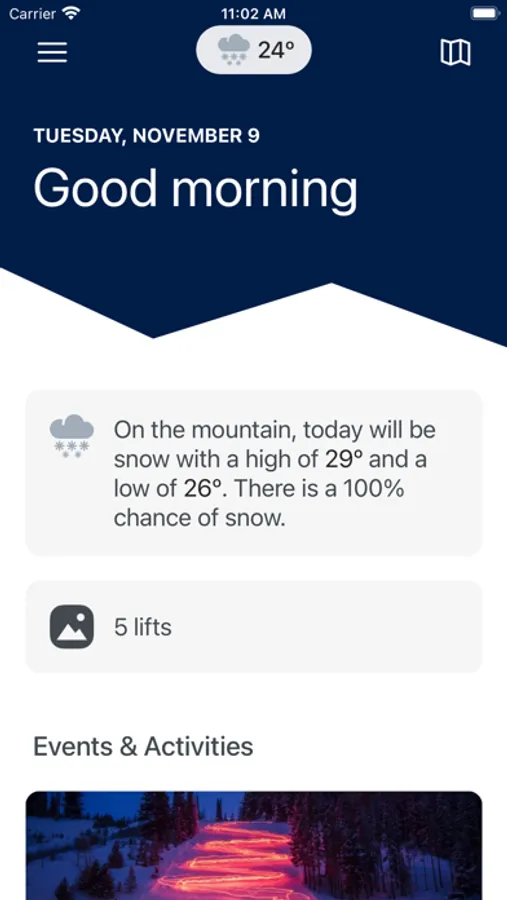 Features a highly visual trail map. Check the live weather conditions, resort videos, webcams, and lift reports. Stay up to date on all the resort conditions. Access to real-time information can keep your snow experience fun and exciting. Easily access all of the mountain's deals and be the first to find out about upcoming events.