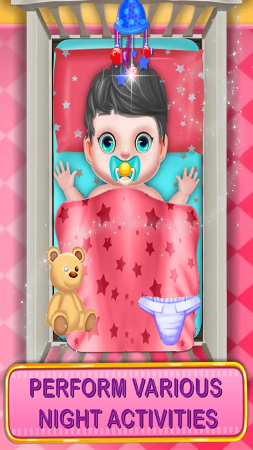 In the first scene, your baby is hungry, so let's prepare a food and feed him. After that, clean his mouth and give him a bottle of milk. Due to illness, the baby is crying so apply tube on his chest, change the diaper, wear the socks and much more activities. After that, let's do tons of morning activities like give him a refreshing bath in the bath tub, brush his teeth, apply the shampoo and much more. In this next scene, you have to put different toys at the right place and also learn various shapes by playing an interesting game. After all that work and playing, the baby is tired and sleep. Now, give him his favorite toys to get a good night's sleep. At last cover the baby with a funky bedspread.