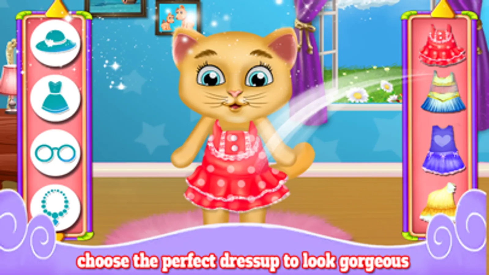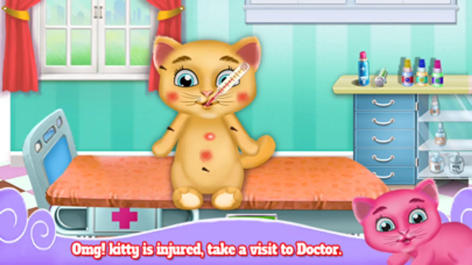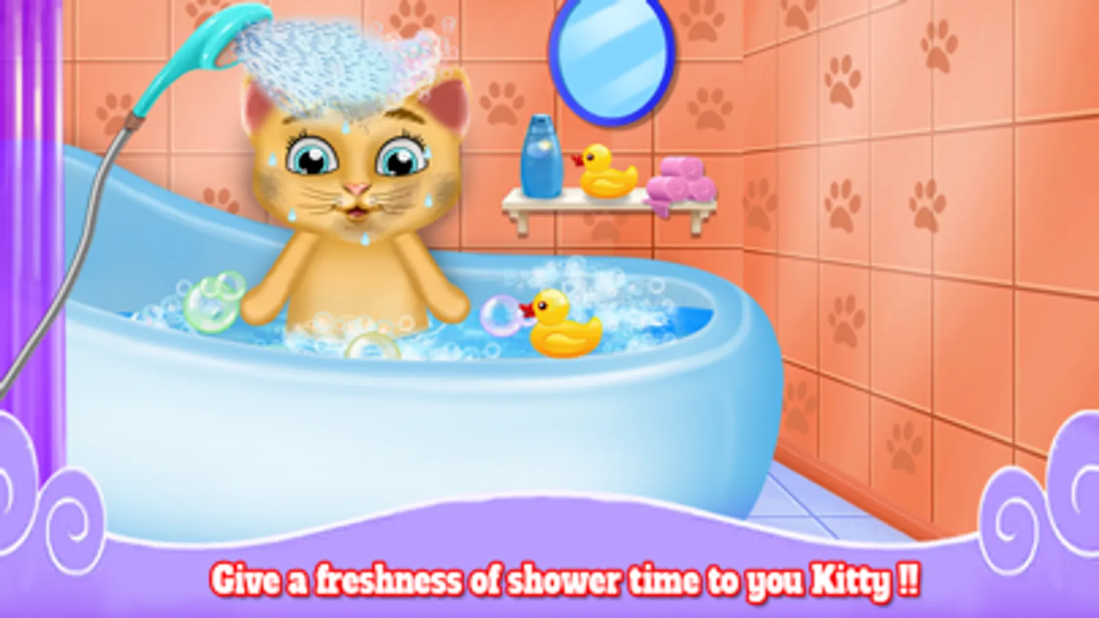 In the first scene, give your virtual cute kitten a refreshing bath and clean her up nicely. Then choose amazing outfits to dress her up from a huge wardrobe collection in this kitten care game. After that, spend some time with your friends at the playground and play different games. At the playground, kitten got injured so let's take her to the clinic and give her proper treatment. Keep your cute kitten always happy by completing all the activities in this kitten day care game. At night, little kitty is not able to sleep so, help put her sleep.