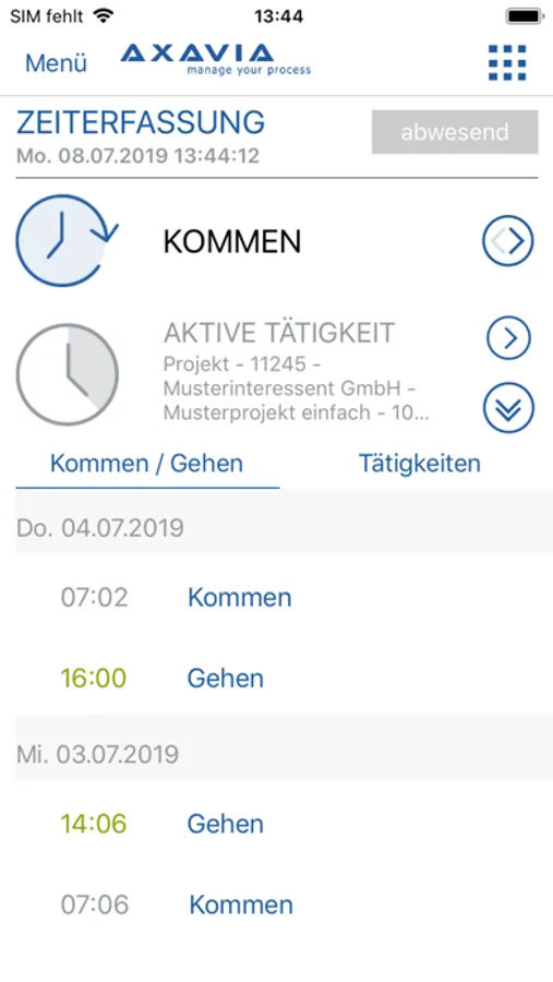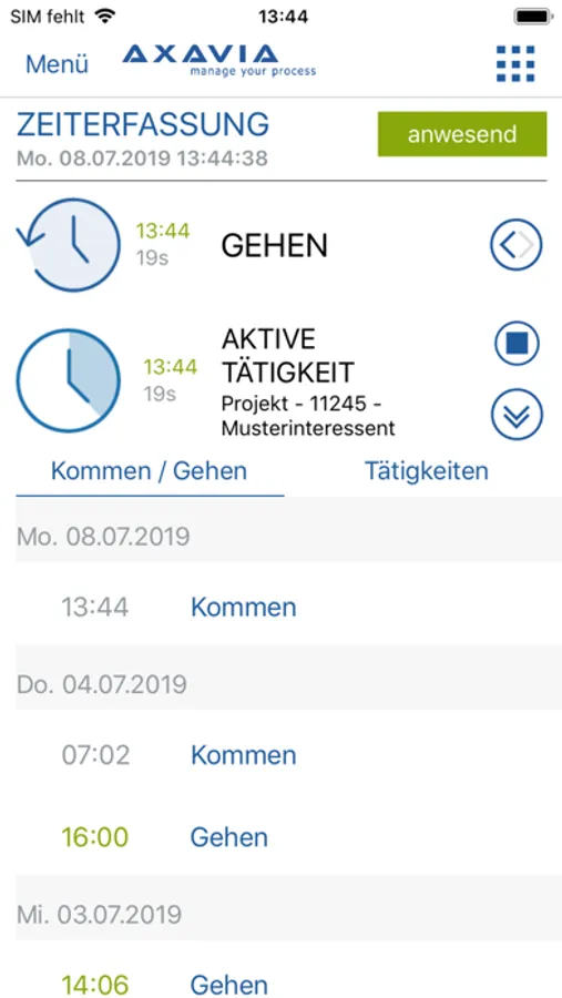 • Kommen und Gehen Zeitaufzeichnungseinträge