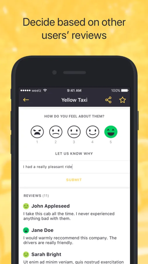 Weelz collects all types of rides that you can call to pick you up and drive you to a certain destination. We call them simply - Rides. All Rides are sorted by rating, generated by community reviews, so you have information about Ride’s quality.