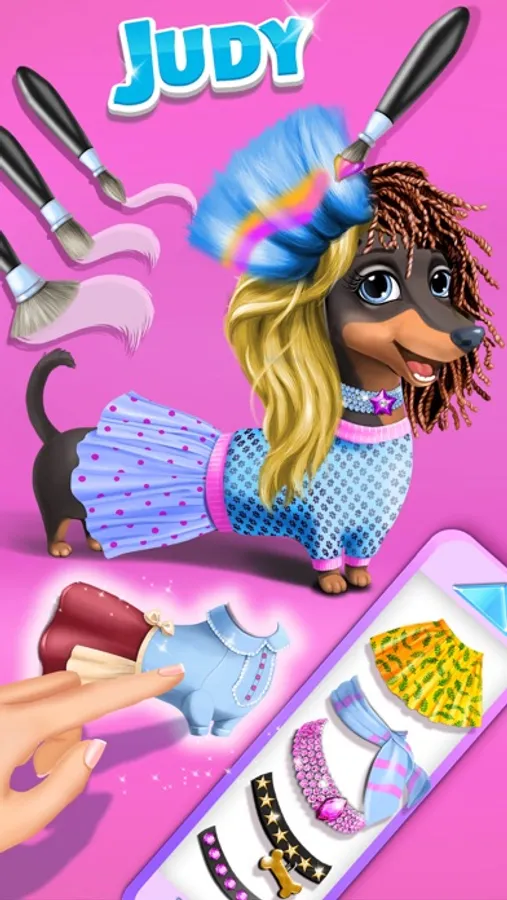 · Help Judy the dog look beautiful with fancy girl clothes!