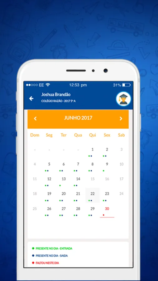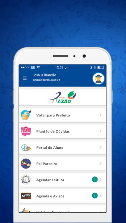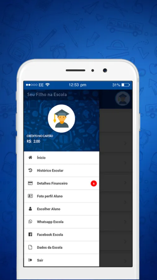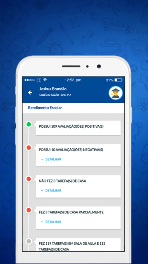 Neste aplicativo é permitido validar as informações cadastrais de matrícula do aluno, visualizar suas notas e interagir com os professores.