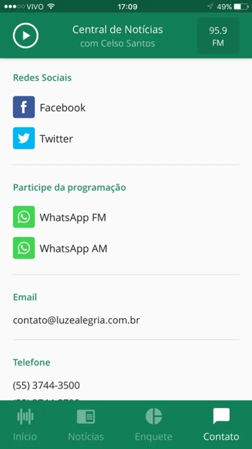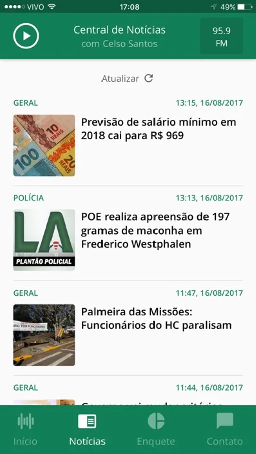 Nele, você terá acesso a toda programação da AM 1160 e da FM 95.9, notícias de Frederico Westphalen e região, além de poder participar de uma enquete.