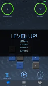 Politonus keeps track of your progress and tells you when you've reached a master level in the current settings so you can confidently move on to a more complex ear training workout (Both note streak and accuracy circles will turn green).