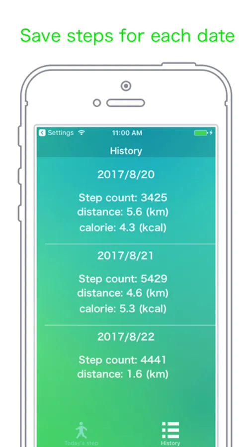 Just by launching the application, measure the number of steps, distances and calories burned that day.