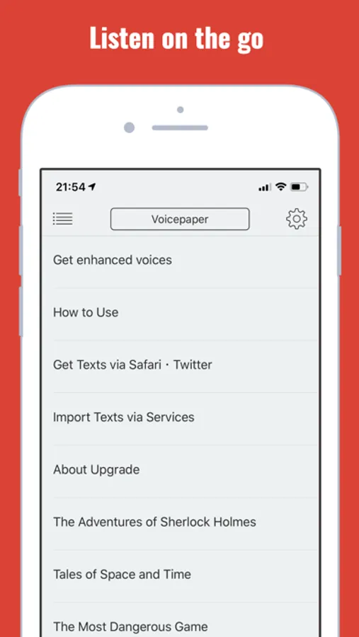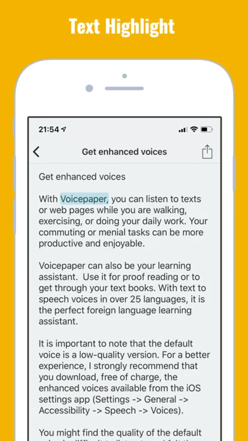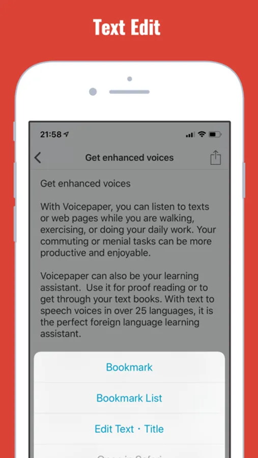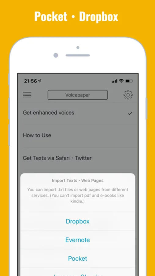 Voicepaper is a powerful app that allows you to listen to texts from Safari, Copied Text, GoogleDrive, Pocket, Dropbox, Evernote, and more in over 25 languages.