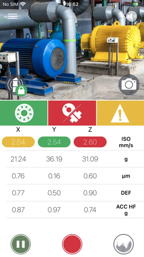 - Automatic comparison of the vibration velocity to the ISO10816-3 standard and display of the vibration alarms in a color code (green, yellow, red)