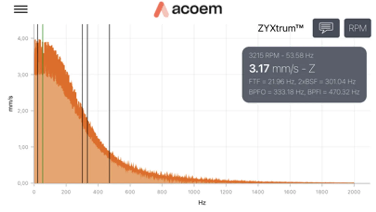 - 3D spectrum display merging X Y and Z directions for easy vibration diagnostic confirmation: the ONEPROD ZYXtrum™