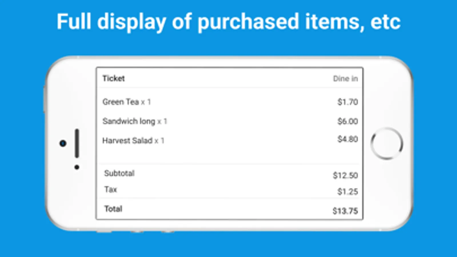 - Order Information: The display shows all the relevant details of customer's order, including items, taxes, discounts, and total amount due.