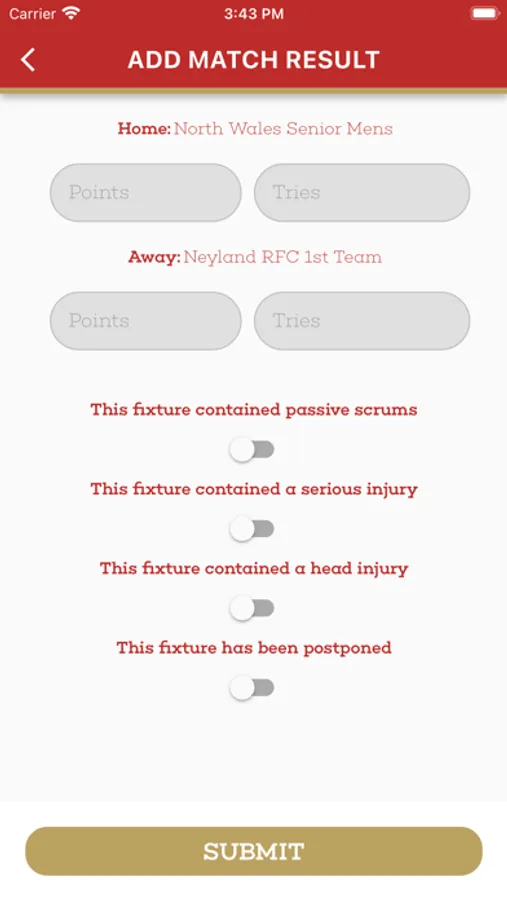 A tool provided to Welsh Rugby Union referees for the submission of match results and discipline reports.