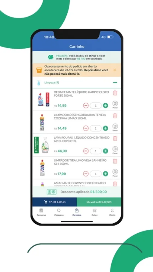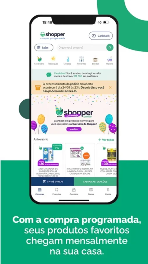 Além disso, você receberá alertas te lembrando de alterar sua cesta antes de suas entregas agendadas. Assim ficará ainda mais prático fazer o reabastecimento mensal da sua casa!