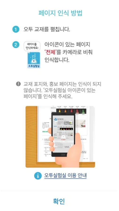 오투 교재 내 아이콘이 있는 페이지를 카메라로 바로 인식하여 실험 동영상으로 연결됩니다.