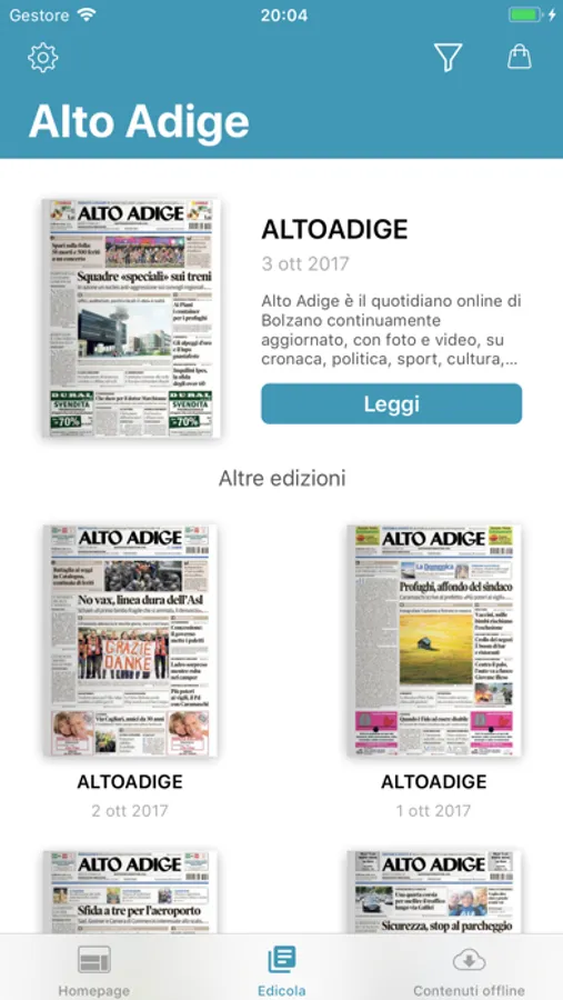 Tramite l'acquisto di una delle offerte si riceve l'abbonamento del quotidiano Alto Adige. Il tempo di sottoscrizione può essere scelto tra 7giorni (4,99€), un mese (19,99€) e un anno (199,99€). Tutti abbonamenti si rinnovano automaticamente per il periodo di sottoscrizione scelto. Naturalmente si possono interrompere, disdire o cambiare l’abbonamento tramite il Suo Apple account. Questi gestioni si possono effettuare tramite il Suo Apple-Account. Per ulteriori dettagli visita https://support.apple.com/it-it/HT202039. Il rinnovo dell’abbonamento verrà effettuato automaticamente 24 ore prima della scadenza del periodo di sottoscrizione. Se l'abbonamento non è più desiderato, dovrà essere disdetto entro 48 ore prima del rinnovo automatico sul proprio Apple-Account. Il pagamento verrà effettuato attraverso il proprio Apple-Account.