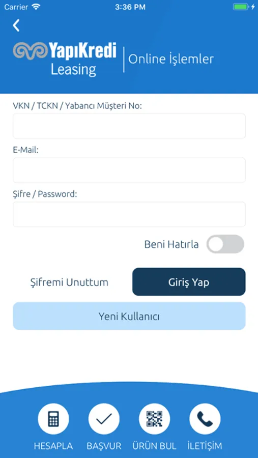 Yapı Kredi Leasing’e VKN/TCKN / Yabancı Müşteri No, e-mail ve mevcut şifreniz ile giriş yapabilir veya Yeni kullanıcı menüsünden yeni bir şifre alabilirsiniz.