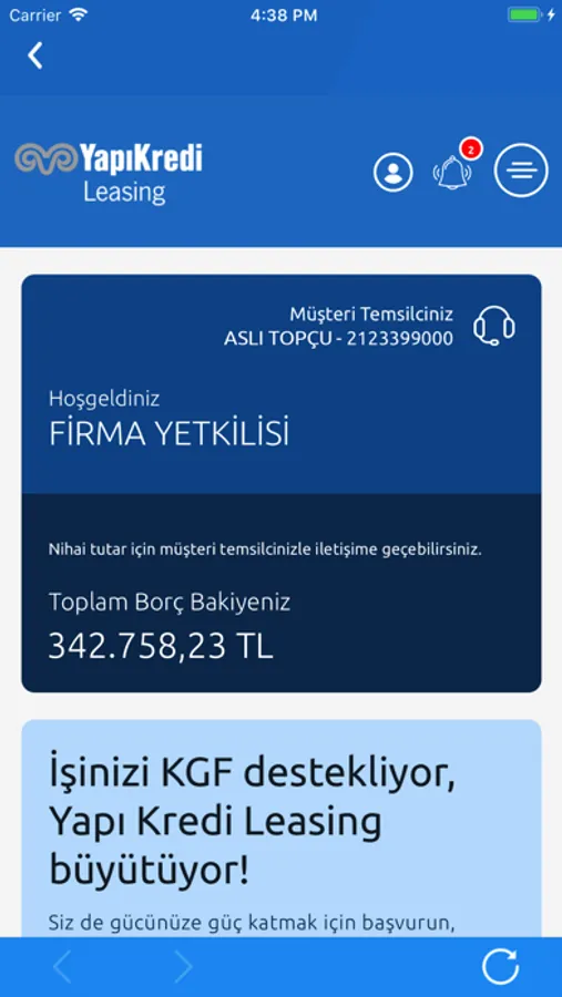 Yapı Kredi Leasing Mobil’de, ödeme planları, faturalar gibi sözleşmelerinize ait bilgilerinizi tüm detaylarıyla hızlıca görüntüleyebilirsiniz. Vergi ödemeleriniz için BA/BS mutabakatlarınızı alabilir, yeni işlemlerinizin hangi değerlendirme aşamasında olduğunu takip edebilirsiniz. Ayrıca o ay ödenmesi gereken tutarları ve gecikmiş bakiyelerinizi bildirimlerimden görüntüleyebilir, tüm kalan borcunuza işlem yaptığınız döviz tipi bazında ulaşabilirsiniz. Birden fazla firmanın temsilcisi olan kullanıcılardansanız, tekrar giriş yapmadan firmalar arasında geçiş sağlayabilirsiniz.