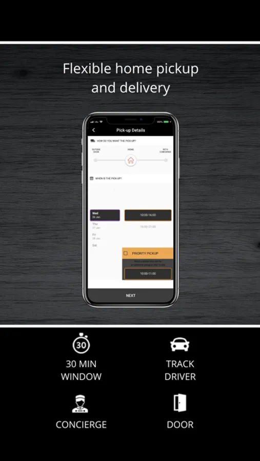 • Convenient home pickup and delivery options - choose from 30 minute time slots, door service, or concierge