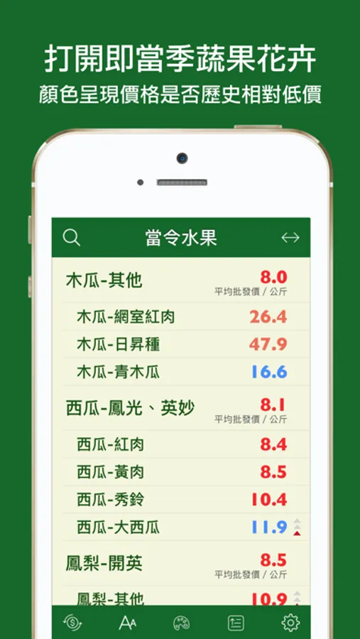 - 打開即列出近期相對歷史價格便宜的蔬果生鮮花卉,並分四等級(紅、淺紅、淺藍、藍)來代表相對便宜到相對偏貴等級。