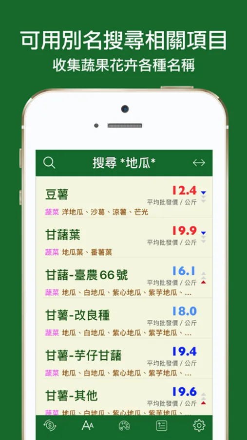- 有收集各品項的別名,比如 (地瓜、甘薯) 或者 (甘藍、高麗菜) 等不同名,卻是指同一種菜,避免不知該品項在批發市場的正式名稱而找不到的問題。
