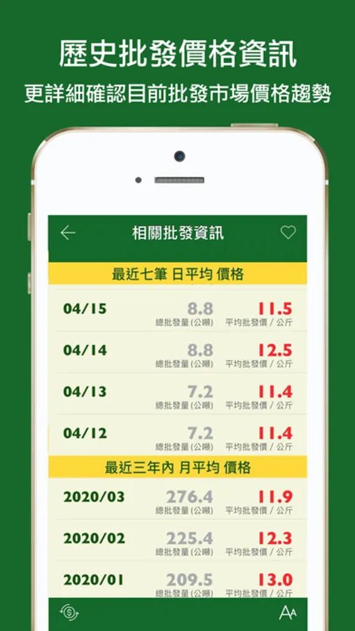 - 可查詢各品項,最近七組的日平均批發價,以及近三年月平均批發價,方便了解價格的趨勢變化。