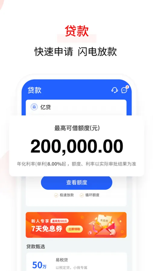 【亿贷】 额度20万(以审批为准),年化利率低至8.00%,快速审批,按日计息,随借随还。
