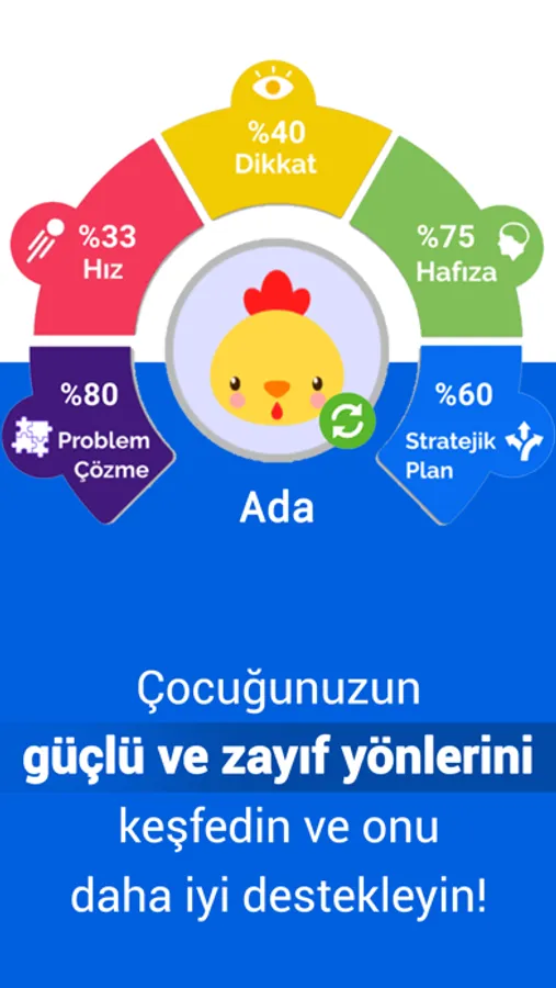 Eğitlence okul kategorisinde çocuğunuzun oynadığı oyunlardan elde edilen verilerle yapılan bilimsel analizler ile güçlü yönlerini öğrenebilir, geliştirilmesi gereken konuları farkederek ona destek olabilirsiniz.