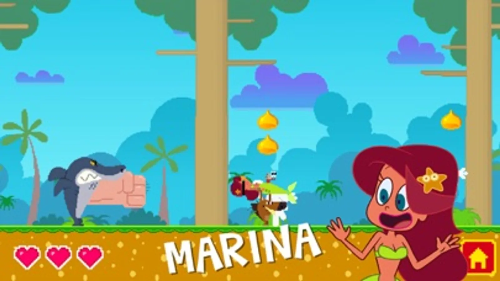 Play this retro arcade game as seen on TV in Zig & Sharko « Stepfather » Episode. A desert island, a starving hyena and one obsession: eat the mermaid! Zig’s dream might even come true… Marina set up house on the beach! Problem: so has her bodyguard, the shark! Ouch!