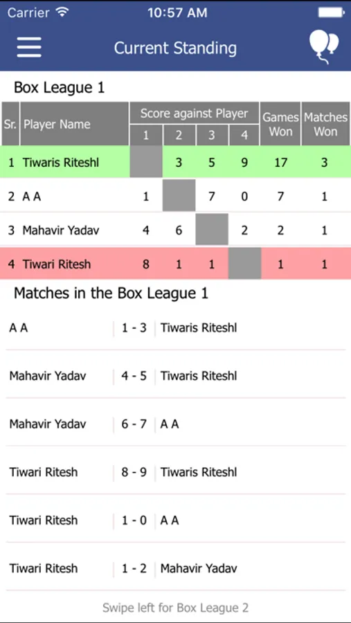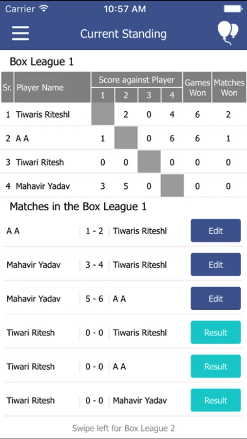 Use this app to view current standings and edit results for ‘Singles Box Leagues’ you have set up at www.PlayTenn.is. Players in each league can view their box and record their results through the ‘Play More Tennis’ app.