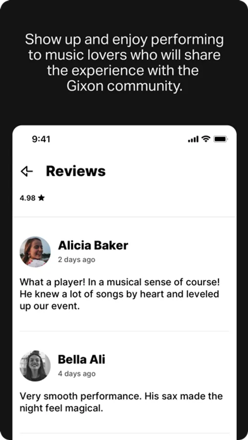 The Gixon app allows you to find available artists near you who are perfect for your events and