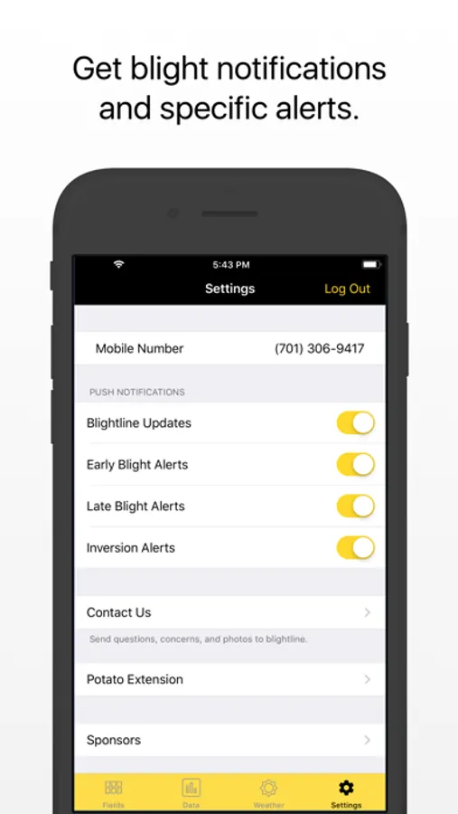 This app utilizes weather data from the North Dakota Agriculture Weather Network (NDAWN) and individual field locations to improve accuracy on late and early blight prediction. The development the potato blight application increases convenience and information available to assist with farmer’s decisions. It allows each potato field to have alerts when severity values are close to threshold as well as provide messages with custom information, including local late blight outbreaks to each user. This will increase the accuracy of predicting late blight and early blight, decrease pesticide use, and improve prevention and control of these diseases. Late blight is a communal disease and easily spreads to nearby fields. By combining model data with NDAWN’s real-time information into an application, potato growers will be provided with an improved, comprehensive overview of potato field conditions, therefore enhancing the timeliness and efficiency of decision making. These benefits should greatly reduce spray drift potential, spraying during inversions, spray frequency and increase grower knowledge on current field and weather conditions. The purpose of this app is to improve potato late and early blight management by allowing specific model information for individual potato fields and alerting growers of current conditions and provide them the best management tools.
