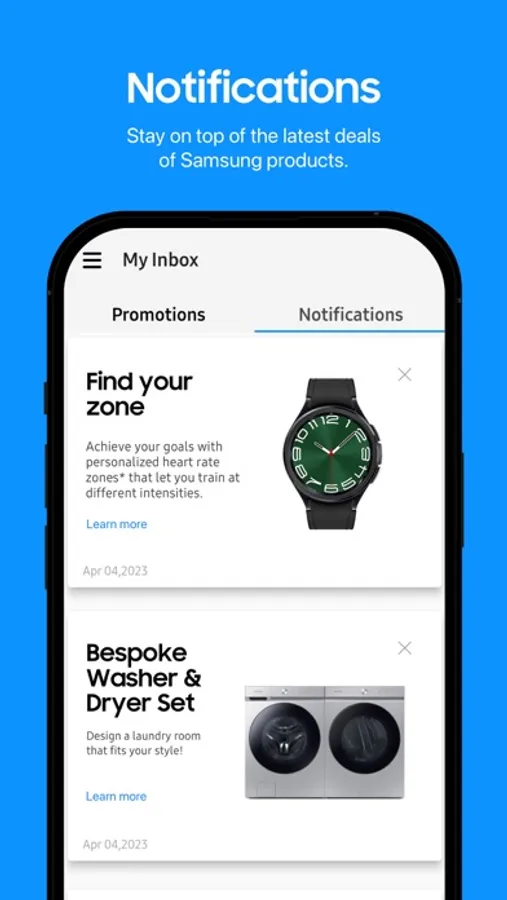 The best way to stay updated on the latest Galaxy Z Fold5, Galaxy Z Flip5, Tab S9 Series, Galaxy Watch6 Series and more. Shop the curated deals, get personalized recommendations, and unlock exclusive offers on Shop Samsung App.
